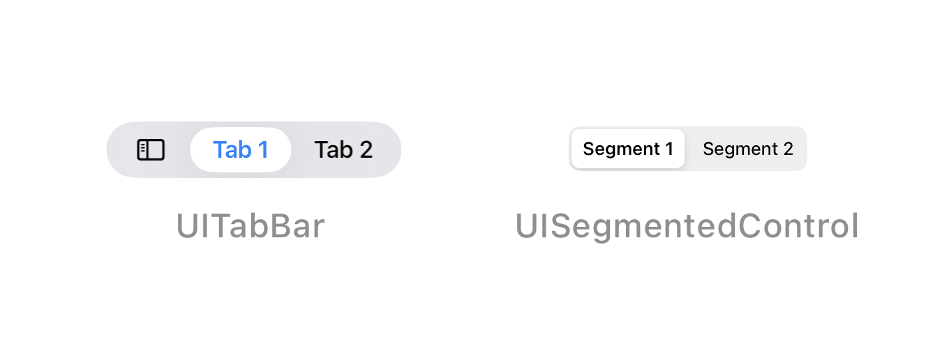 This new design might look familiar because a similar control has been used in the Photos app for a few years. Essentially, it functioned as a custom segmented control to switch between different views (Months, Year, All, etc.). Coming from that, its resemblance to UISegmentedControl is no coincidence; both share the same design philosophy. However, this similarity introduces some challenges. While both the tab bar and the segmented control look alike, they serve different purposes. Switching tabs usually changes the entire view and context, whereas a segmented control typically changes the state within a single view (e.g., in the Calendar inbox, where you can switch between all and accepted events). We will revisit this point later.