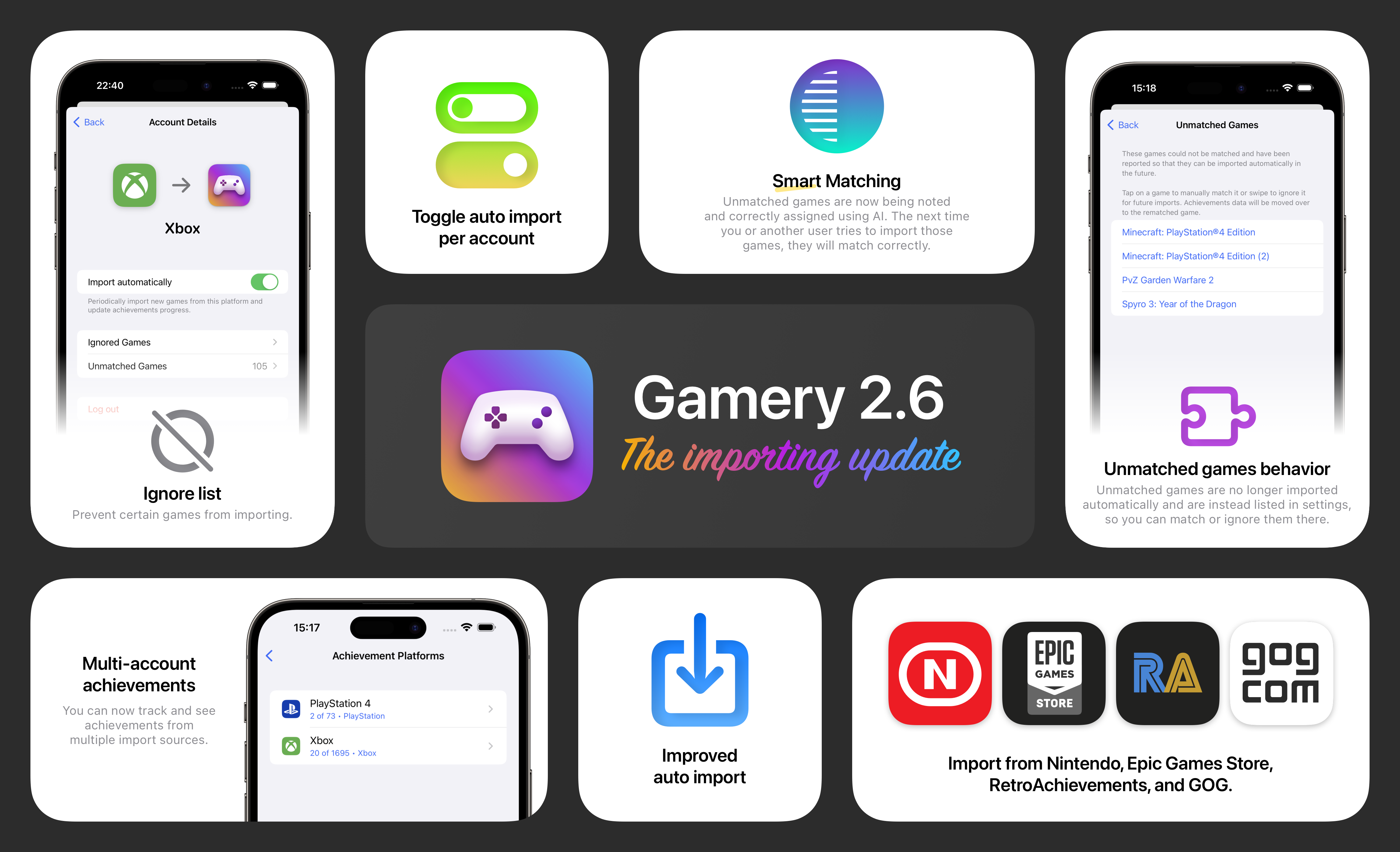 Gamery 2.6 introduces four new import services and a lot of improvements for the importing system.
